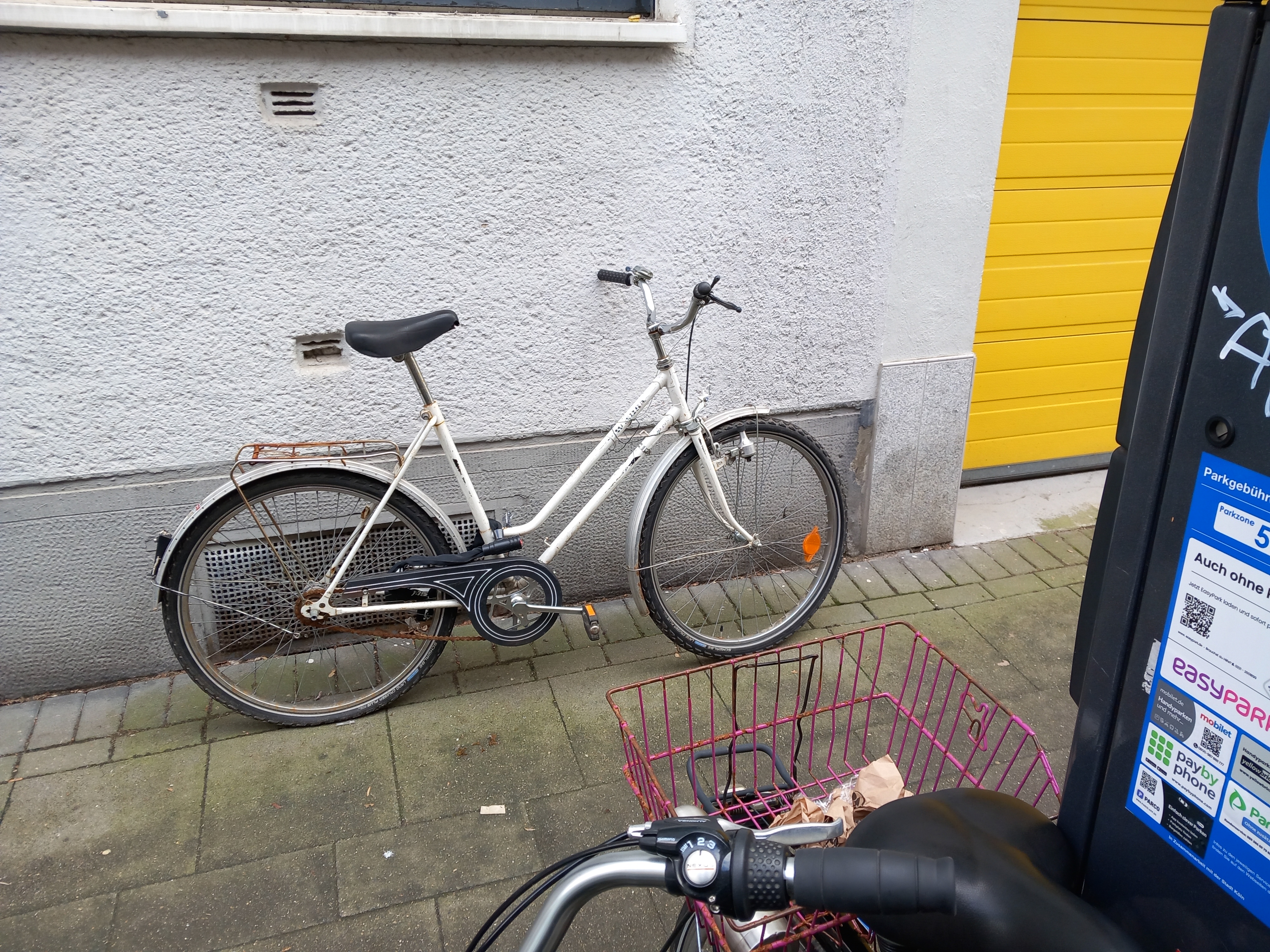 Ein weißes (scheinbar) 26 Zoll großes, weißes Damenfahrrad steht seit mehreren Monaten fahruntauglich (2 platte Reifen, Kettenrost s. Bild läßt vermuten, dass es schon jahrelang nicht mehr gefahren wurde) neben unserem gelben Garagentor. Manchmal wird es von Anwohnern an den Parkschein-Automaten gestellt, wenn es ihnen an der Hauswand verkommt. Bitte beseitigen! Danke.