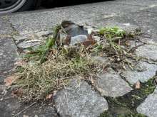 Stadteinwärts stehen ganz viele Pflastersteine auf dem Radweg hoch. Extreme Unfallgefahr.